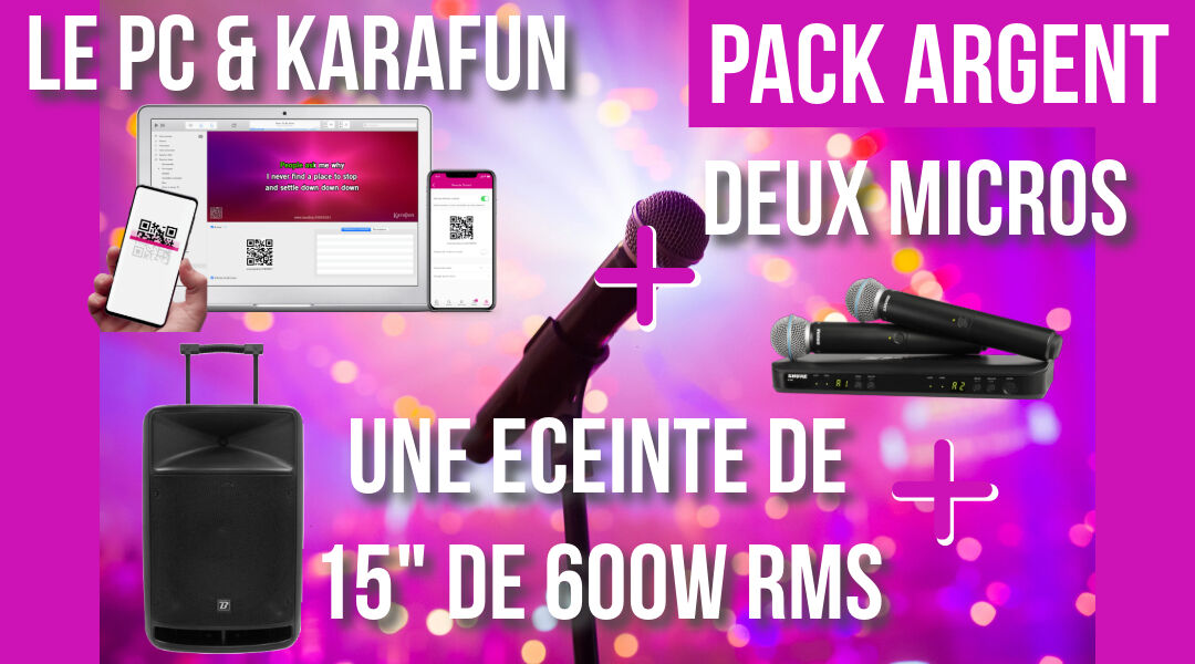 Vous ne disposez pas d'une sonorisation où il est possible de raccorder un pc et deux micros ? Pas de soucis avec cette formule. C'est une enceinte de 600 W RMS professionnelle qui sera montée chez vous pour la soirée.