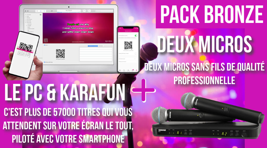 Pack idéal si vous disposez déjà d'un écran et d'une sonorisation où il est possible de raccorder un pc et deux micros.