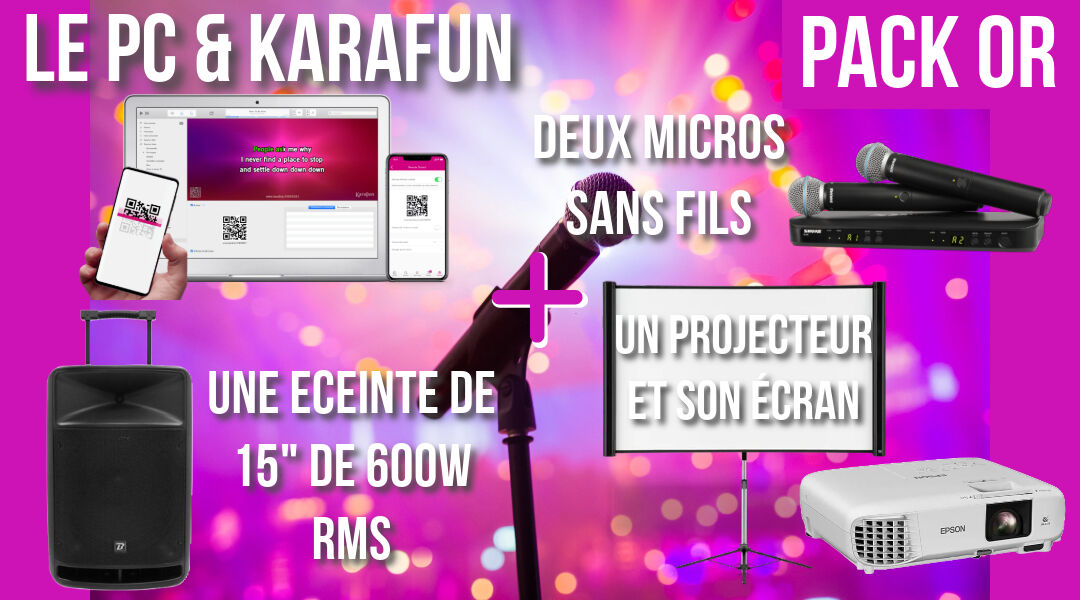 Avec ce pack, ne vous souciez de rien! Nous apportons tout le nécéssaire ! Ce seront une enceinte professionnelle, deux micros sans fils, un projecteur HD et sa toile qui se joindront à la fête.